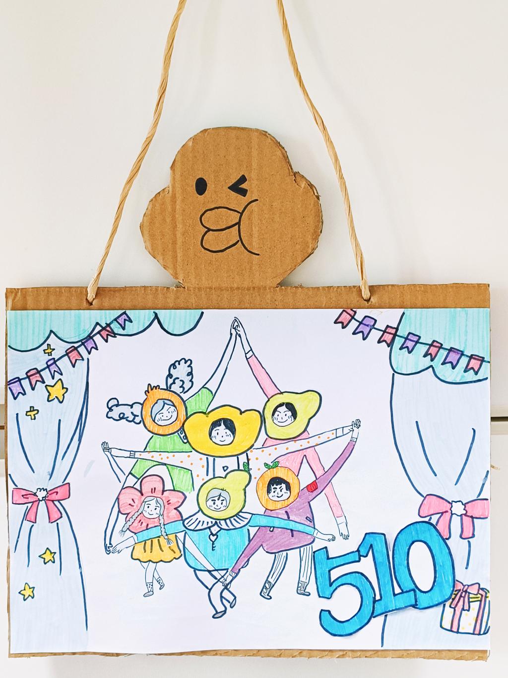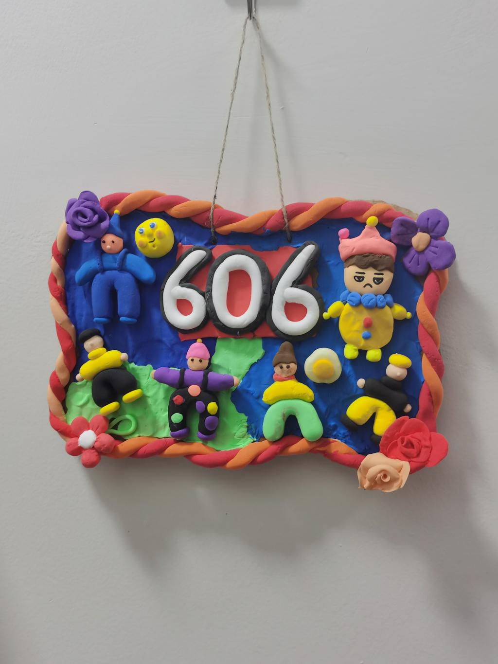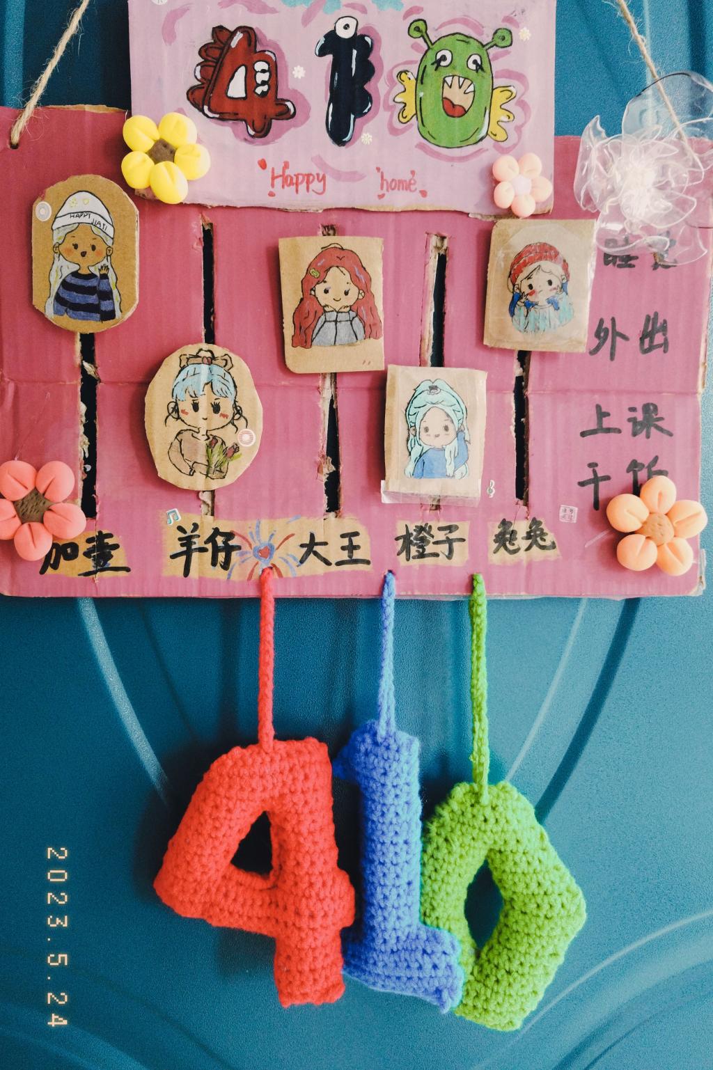 寓意:整个门牌以粉色系为主色调,彰显着我们充满活力的青春。其中最显眼的个人头像,代表了我们每个人不同的风格与个性。头像右侧的“睡觉”,“外出”,“上课”,“干饭”则表示了我们在校园里的日常生活。而五朵颜色不同,大小不同,甚至款式不同的花朵,更代表着我们的性格不同,但又在相处的过程之中绽放属于自己的绚烂。不仅如此,门牌上方机灵搞怪的“410”以及门牌下方悬挂着以三原色编织的“410”,更蕴含着我们对于宿舍的爱、对于手工的浓烈兴趣、最重要的是我们之间的爱与温暖。