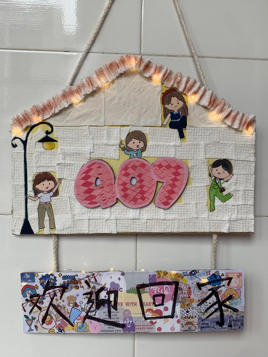 寓意:我们的作品整体是一个房子的外观,寓意着宿舍如同一个大家庭。作品里画的为宿舍的四个成员,下方的欢迎回家让求学在外、异地他乡的我们在宿舍有了如家一般的温暖和归属。制作的材料也一切以环保简约为主,回收利用了快递纸盒、洗脸巾和过期化妆品等为原材料,彰显了我们作为环境学院学子的环保意识。
