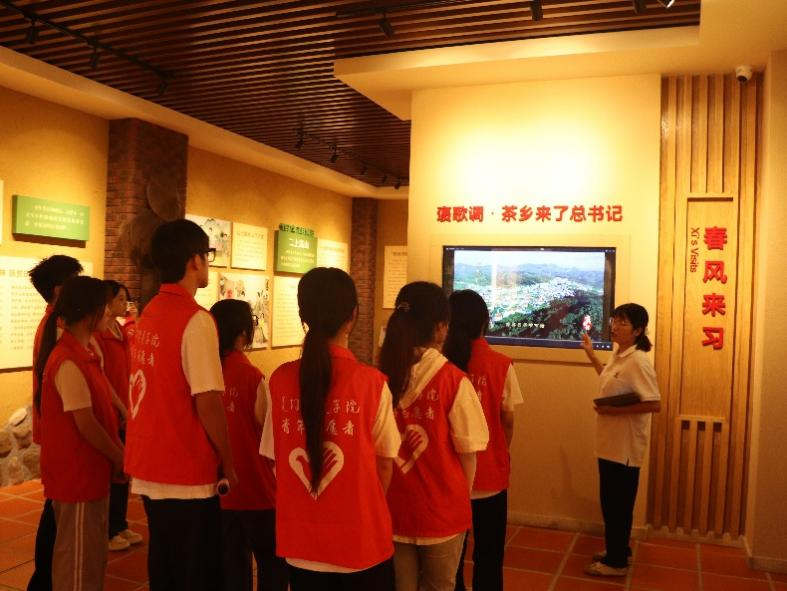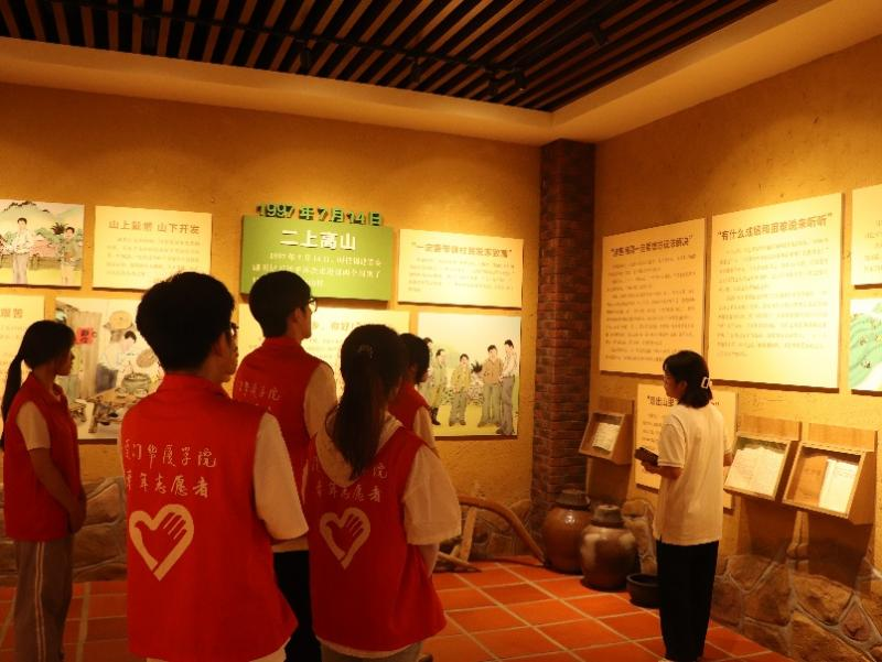 实践队首先踏入高山党校初心使命馆,开启军营村“高山初心之路”的首站。在讲解员的带领下,实践队队员们依次参观“两上高山情缘”、“厦门探索足迹”、“鹭岛红色印记”、“践行特区使命”等展厅,认真观看珍贵的历史图片、文献资料和影像记录。通过详实展陈,实践队队员们深刻领悟习近平同志提出的“山上戴帽、山下开发”“扶贫扶志”的宝贵思想理念,以及这座高山区贫困村是如何让逐渐成长脱贫致富为“百姓富、生态美”的小康乡村,走出一条特色鲜明的“蝶变”之路。