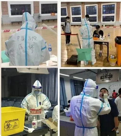 “身着白衣,心有锦缎”。在这场看不见硝烟的战斗中,医学检验及康复治疗学骨干教师蔡尽忠、苏思颖、董竑麟、陈婷、张燕宇、黄晴、谷诗浓义无反顾地投入本轮核酸采样工作中。从接到通知到准备就位,他们用时不到半个小时。随后,待检测物资一到,几位教师便身着白色“铠甲”,以最快的速度投入紧张的核酸检测战斗中,为我们筑起了健康的屏障。“巾帼不让须眉”,作为党员女教师的陈婷和张燕宇虽然是第一次参与核酸采样,但是她们仍旧充分发挥着党员的先锋模范作用,连续五个小时工作在采样一线,直至凌晨。他们以党员的实际行动和使命担当,让党旗在防疫一线高高飘扬,为坚决打好防止疫情扩散蔓延的这场硬仗贡献了力量。