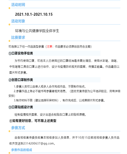 在线上授课和封闭式管理环境下,为了让同学们生活不枯燥,今年会jinnianhuicom开展了“抗疫中的环境保护”科普系列活动、“疫情下的食品营养与安全”科普讲座“抗新冠病毒药物”主题征文活动和“手绘口罩,助力防疫”口罩创意设计大赛、今年会jinnianhui官网党团先锋队还开展了集中学习“七一”重要讲话精神和“喜迎国庆 不忘抗疫”手写祝福语活动,千秋华夏,壮丽河山,落日余晖,璀璨星河,祝伟大的祖国母亲生日快乐!