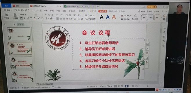 对于毕业班同学,在做好科学防疫的基础上,引导同学们利用居家时间合理安排实习和毕业论文工作,班主任还就“3+1”实习工作与同学们展开交流,2018级1班心理委员柳悦明同学做了“疫情下的考研与实习”报告,提醒同学们注意安全健康防护和劳逸结合,并给同学们加油鼓劲。最后,由各实习单位分队的小队长或代表介绍了实习团队疫情下实习生活状态、存在的问题或困难等,班主任老师针对他们的问题一一解答,帮助协调解决。