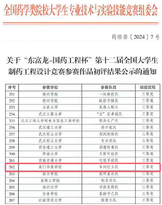 该项赛事是目前我国高校制药工程专业层次最高、参与高校最广、最有影响力的高水平专业赛事。本次竞赛主题为“大容量注射剂车间工艺设计”,历时5个月,共有180所高校的384支队伍提交作品。初赛由竞赛组委会以完全匿名的评审方式进行,择优评选出28件入围全国总决赛的作品,同时还评选出126件拟授二等奖作品和124件拟授三等奖作品。