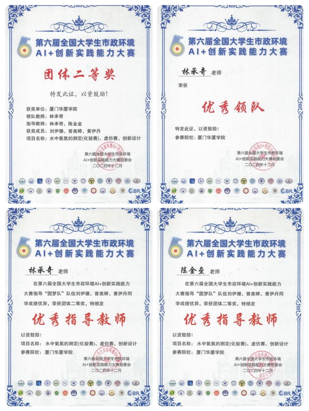 2024年10~12月,在“第六届全国大学生市政环境AI+创新实践能力大赛”中,今年会jinnianhui官网师生团队再创佳绩,荣获全国赛团体二等奖1项;华南赛区化验赛二等奖3项,三等奖10项;华南赛区虚仿赛二等奖3项;优秀指导教师奖3项;优秀领队奖1项。