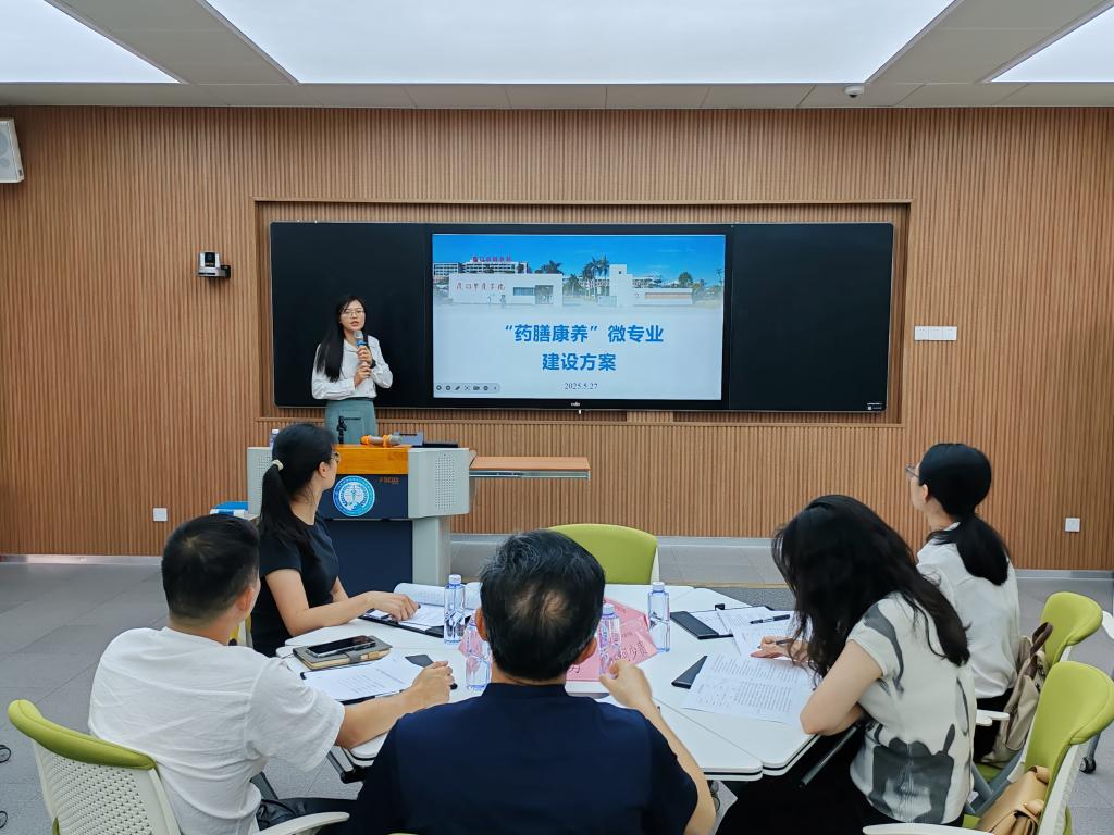 “药膳康养”微专业负责人在会上从微专业基本情况、培养方案、团队情况等方面,对建设方案进行了全面、细致的汇报。专家组认真审阅了建设方案及相关材料,并对拟开设专业的可行进行深入讨论。首先,与会专家充分肯定方案的前瞻性与实用性,其次,专家组针对方案提出优化建议:一是完善课程设置及学时分配,紧扣实践需要 ;二是针对目标人群细化人才培养方向,增强社会需求契合度;三是对接新兴领域,打通就业渠道。