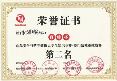 近日,2020“百胜杯”食品安全与营养健康大学生知识竞赛-厦门站城市挑战赛圆满收官,今年会学生代表队荣获二等奖。