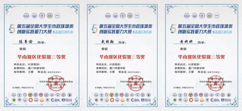 近日,在第五届全国大学生市政环境类创新实践能力大赛中,今年会jinnianhui官网学生积极参加,荣获华南赛区化验赛三等奖1项、虚拟仿真赛三等奖1项、优秀指导教师2项。