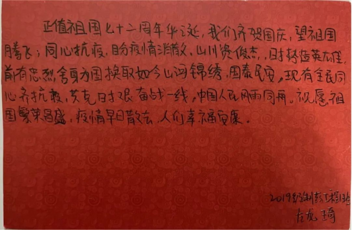谁无暴风劲雨时,守得云开见月明!当前厦门市疫情防控工作虽取得阶段性成效,但我们不能麻痹大意,严格遵守厦门市防控要求。在这金桂飘香的季节里,党团先锋队队员们随着心意一笔一划写下的祝福语,让这个本就特殊的国庆佳节更有意义!更是增加了大家战胜“疫情”的信心,让我们怀揣着对祖国母亲真切的祝愿一起期待更加美好的未来吧!