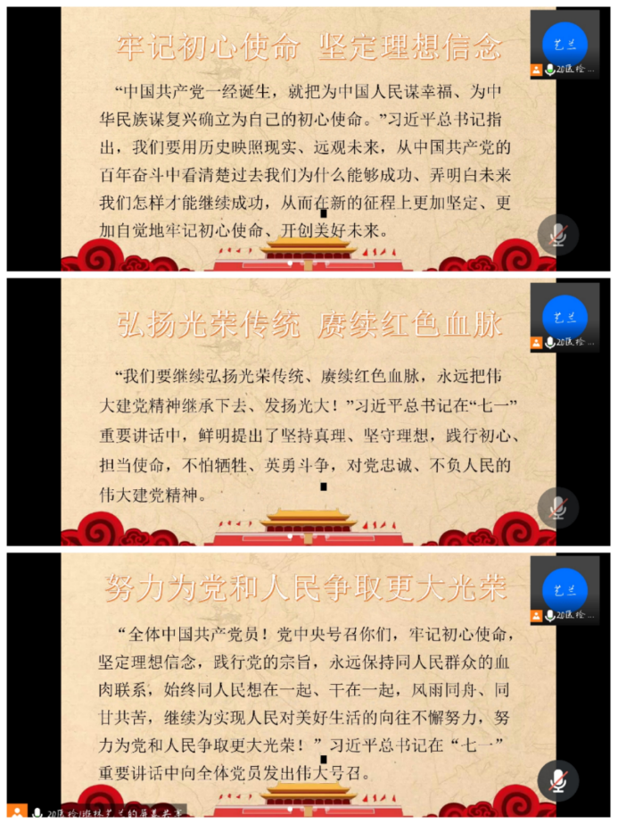 为贯彻落实习近平总书记在庆祝中国共产党成立100周年大会上的重要讲话精神,将学习“七一”重要讲话精神的成果转化为奋进新征程、建功新时代的实际行动。今年会jinnianhui官网党团先锋队宣传活动组于2021年9月16日中午12:30在腾讯会议开展本周“七一”重要讲话精神宣讲。