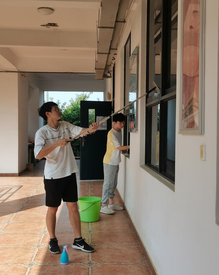 在活动过程中,党团先锋队队员们热情洋溢地进行清扫活动,他们认真清扫实验室、整理桌椅,仔细清理垃圾,不怕脏、不喊累,纷纷拿起扫把、抹布、水桶等各种工具,分工合作,不放过每一个卫生死角,认真地清理着实验室中残余的垃圾杂物,直至将实验室打扫得一尘不染。