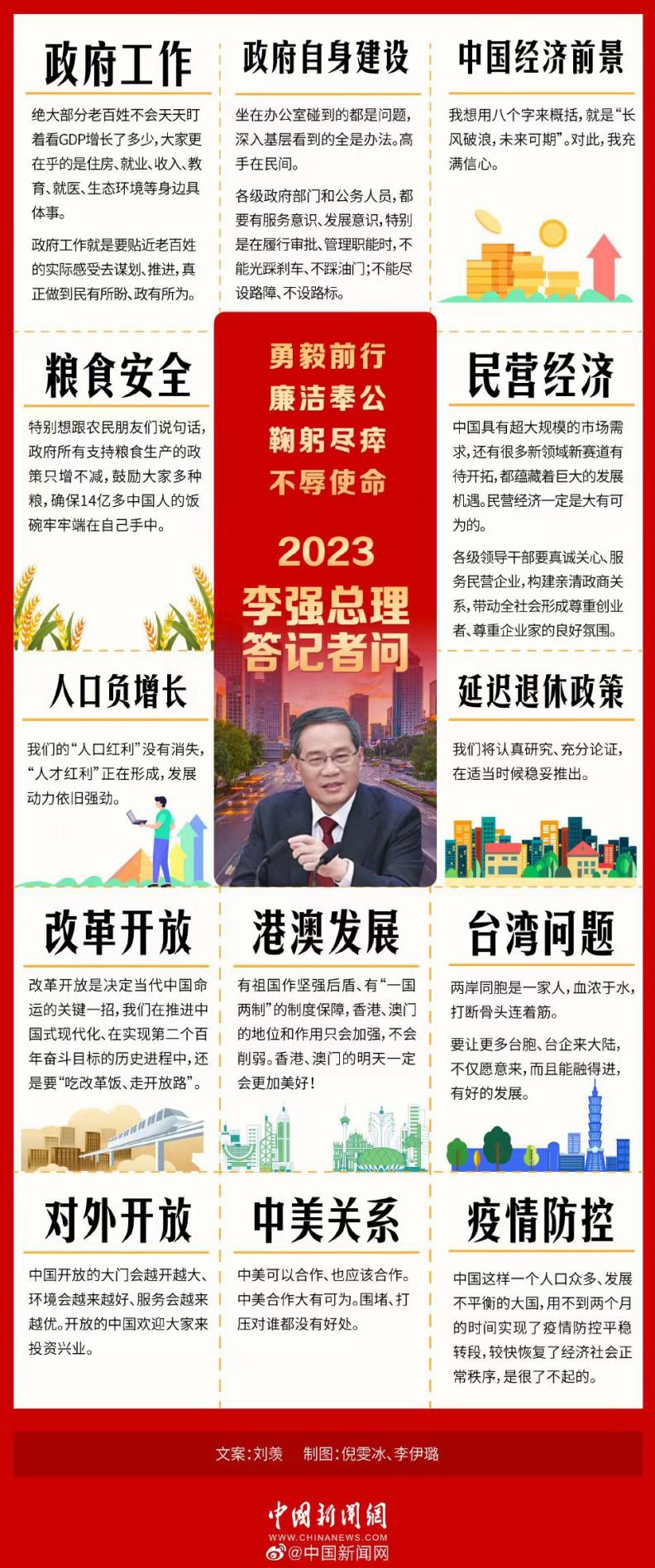 近90分钟的时间里,李强总理一共回答了中外媒体的10个问题,涉及新一届政府施政目标、中国经济前景、港澳发展、民营经济发展、人口就业、疫情防控、两岸交流合作、乡村振兴、中美关系、政府工作作风等,信息量很大,振奋人心!一张图速览~