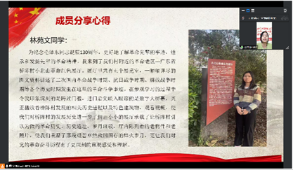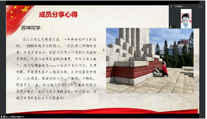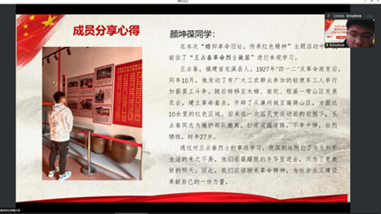瞻仰革命旧址是传承红色基因、弘扬革命精神的重要途径。会议中学生党支部成员分享了他们参观革命旧址后的心得感悟。林宛文同学表示,参观革命遗址让她对党的革命奋斗历程有更深刻的直观感受和理解;苏坤同学表示,要用先辈之志激励自我,为全面建设社会主义现代化国家而团结奋斗;颜坤葆同学表示,参观学习后,更明白当今和平生活来之不易和继承革命精神的必要性,更加坚定为建设社会主义现代化强国贡献自己的青春和力量。大家的深刻体悟无不昭示着青年一代不忘初心、牢记使命的责任与担当。