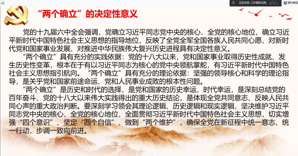通过本次集中学习,我深刻领悟“两个确立”的决定性意义以及我们青年大学生如何坚决做到“两个维护”。“两个确立”是指:确立习近平同志党中央的核心、全党的核心地位,确立习近平新时代中国特色社会主义思想的指导地位。