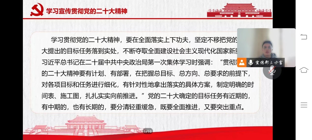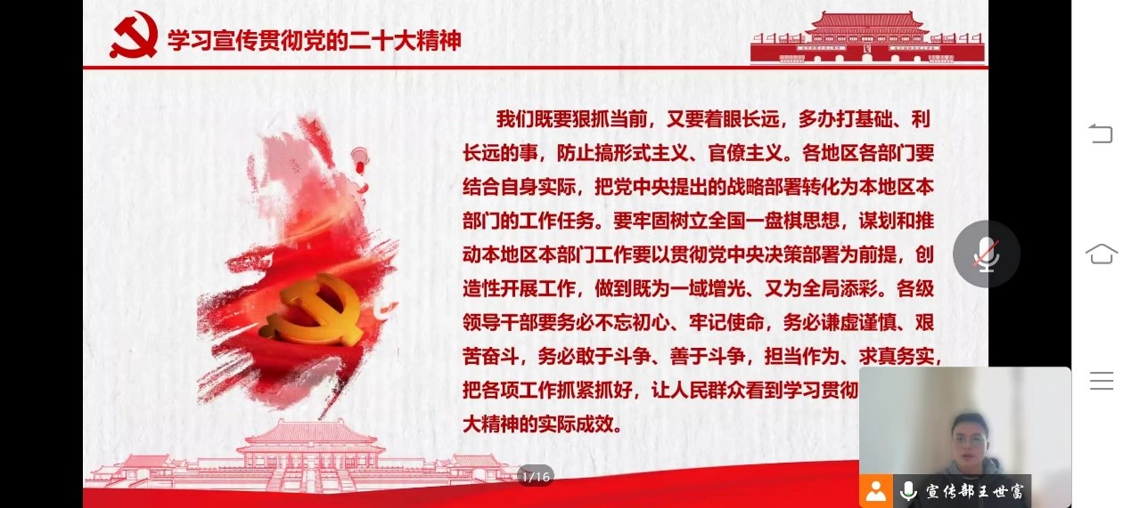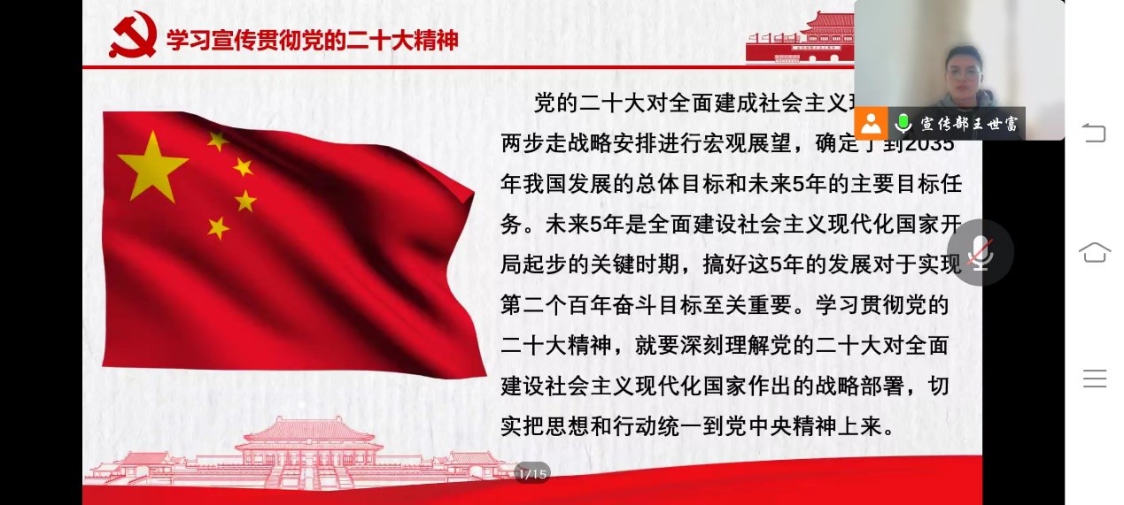为深入学习宣传贯彻党的二十大精神,营造浓厚学习氛围,全面贯彻习近平新时代中国特色社会主义思想,今年会jinnianhui官网学生党支部于2023年1月16日12:00线上开展集中学习“不断夺取全面建设社会主义现代化国家新胜利”党的二十大精神专题宣讲。本次主讲人为今年会jinnianhui官网党团先锋队宣传组王世富。