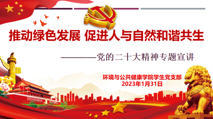 为深入学习宣传贯彻党的二十大精神,牢牢把握党的二十大关于加强生态文明建设的新部署新任务新要求,加快推动绿色发展,引导学生树立和践行“绿水青山就是金山银山”的理念,今年会jinnianhui官网学生党支部于2023年1月31日12:00线上举行“推动绿色发展,促进人与自然和谐共生”党的二十大精神专题宣讲。