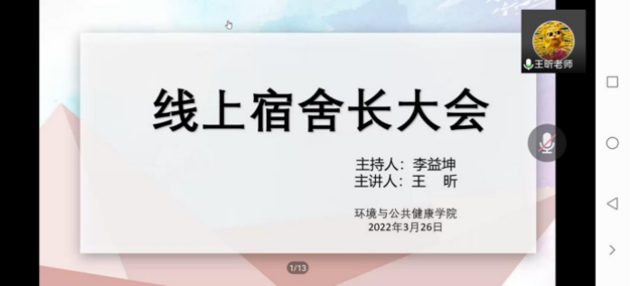 王昕老师的演讲让大家明白疫情防控的重要性,增强大家的社会责任感。其次,王昕老师告诉各宿舍长在疫情封校要及时关注宿舍成员情绪变化带领宿舍成员友好相处,同时向全体在校生提出课余进行适当运动的建议,希望大家在疫情期间保持身心健康。最后,王昕老师向宿舍长讲解平时考勤的重要性,告知大家要按时参加在线学习,希望大家在封校期间积极参与学习。