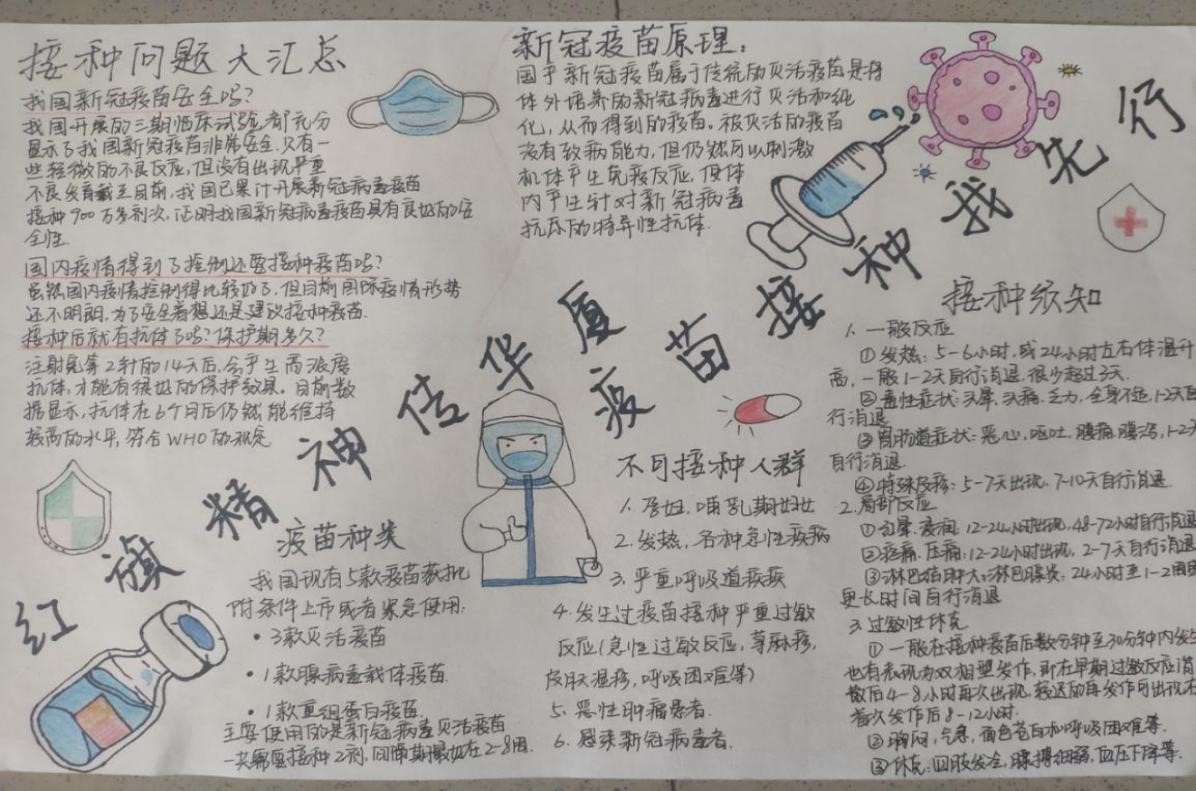 2021年4月28日至5月5日,今年会jinnianhui官网团总支主办的“红旗精神传华厦,疫苗接种我先行”主题手抄报比赛顺利举行。本活动重在提高学生对新冠疫苗的认知,科学普及接种疫苗的重要性,提高在校学生接种率,形成群体免疫屏障,减少感染风险,积极接种新冠疫苗,为防控疫情出力量。