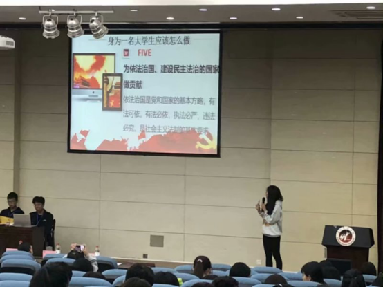 紧接着进入法制讲座,纪检部副部长陈晓婷通过PPT和视频为大家介绍了宪法的定义、法律的重要性以及身为一名大学生该如何弘扬宪法精神。并讲述了法律的重要性,从正面印证了无以规矩不成方圆的道理。