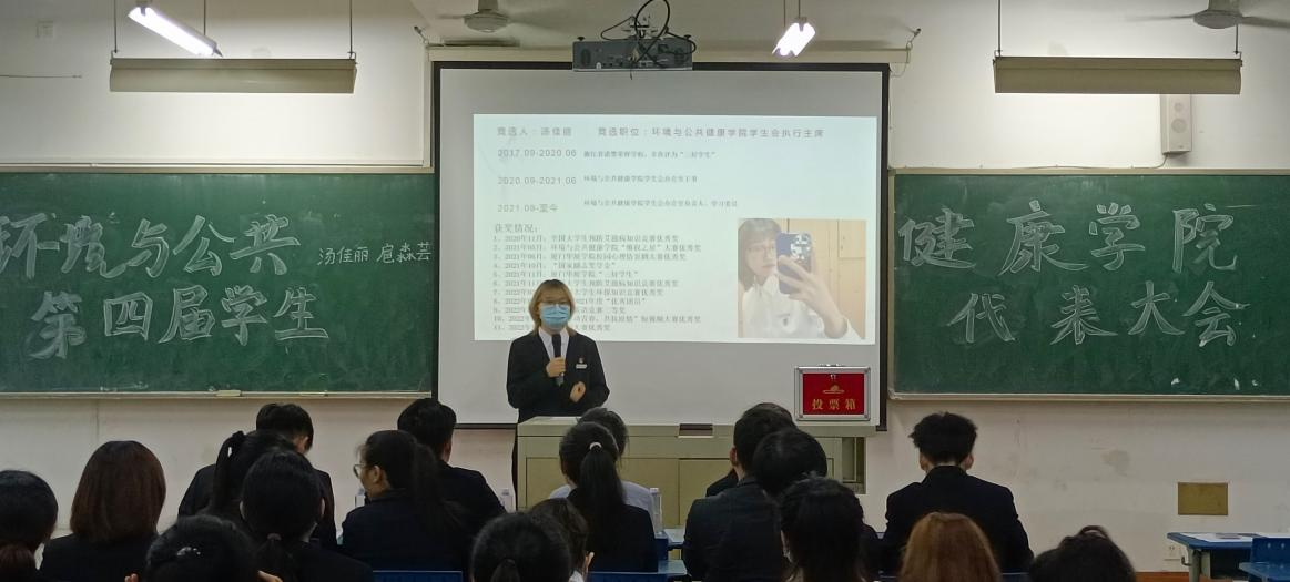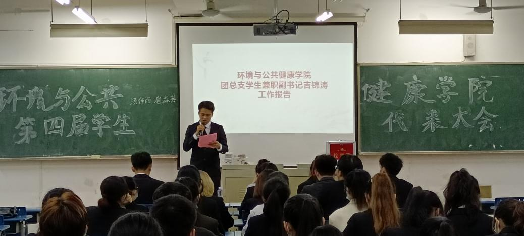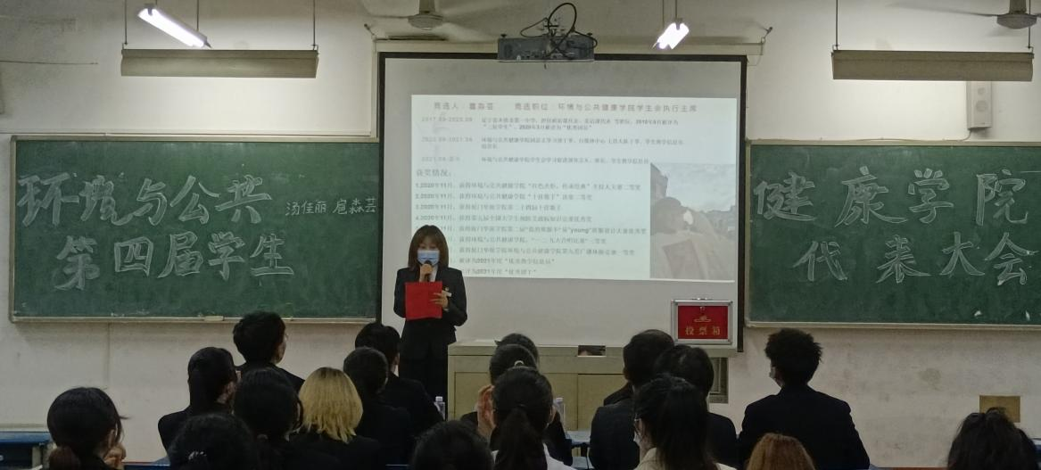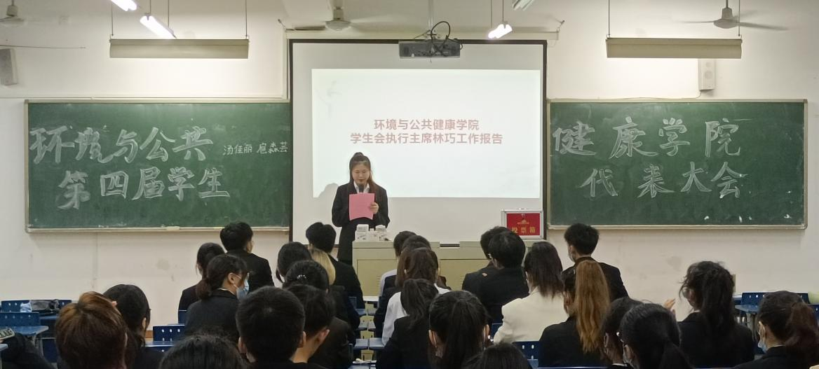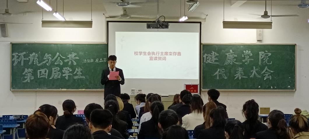 大会在主持人的致辞中拉开了序幕,全体人员起立奏唱国歌迎来了大会的正式开始。首先,校学生会执行主席栾存鑫进行宣读贺词,栾存鑫同学代表校学生会对环境与公共健康学院学生会这一年以来贡献给予了高度的评价,并为新一届学生会工作的展开给出了一些建议。