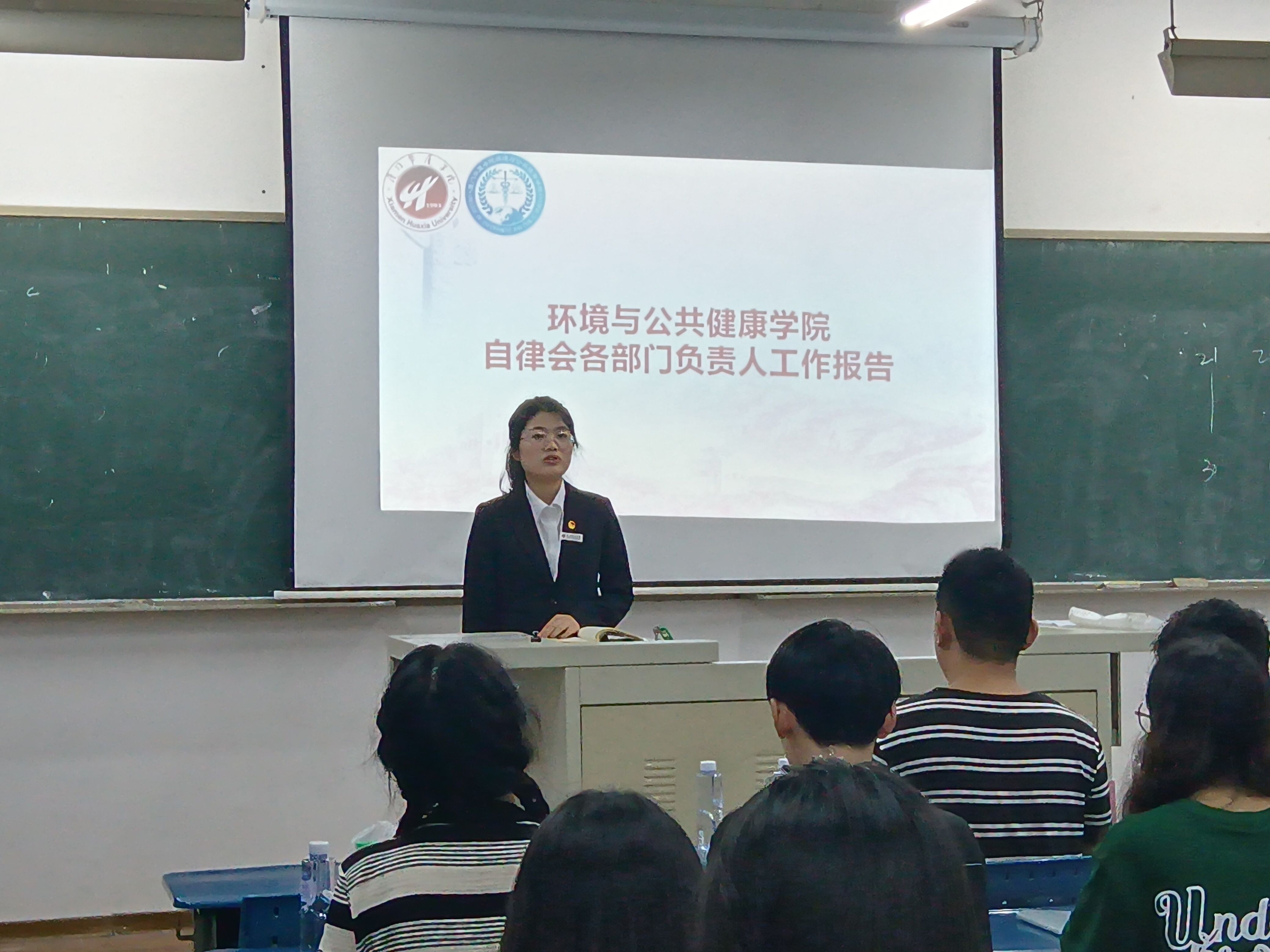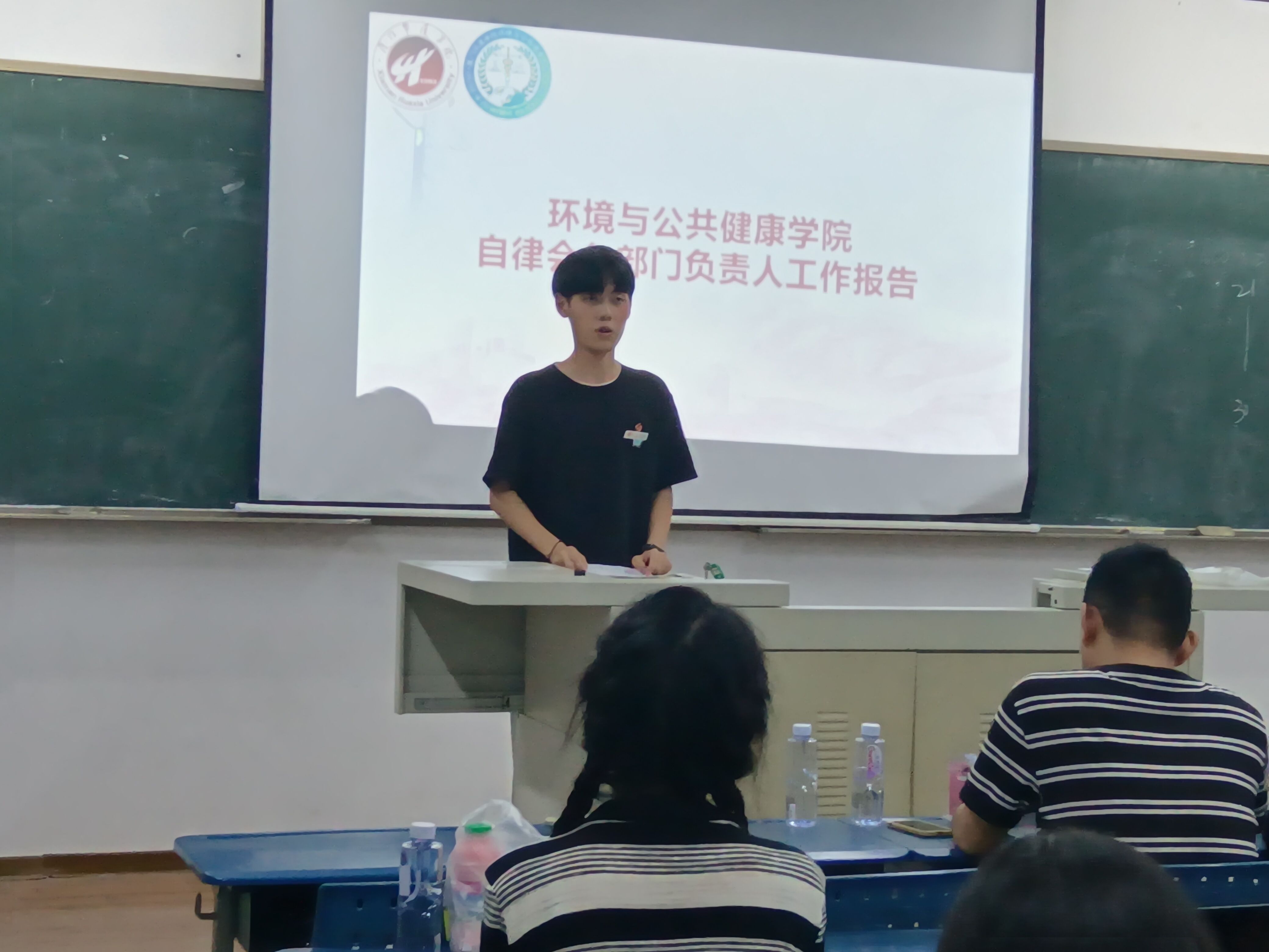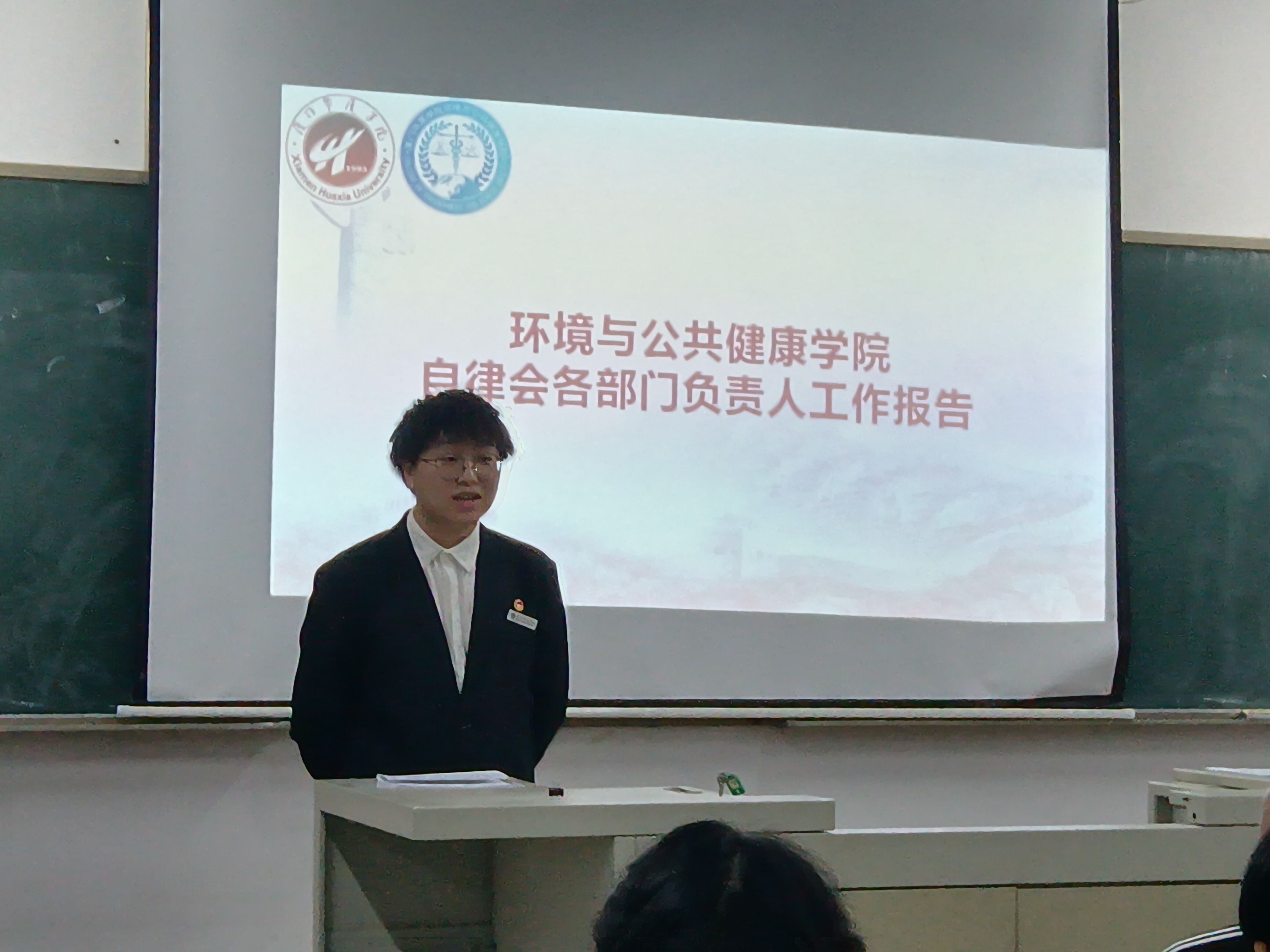 首先,由秘书部部长吴文华、生活部部长李银心、纪检部部长朱佳玲、生活部副部长郑智慧、纪检部副部长赵鸿胜依次进行工作报告。他们总结了环境与公共健康自律会过去一年的各项工作展开情况,同时也对下一届学生组织的内部建设提出了宝贵的建议。