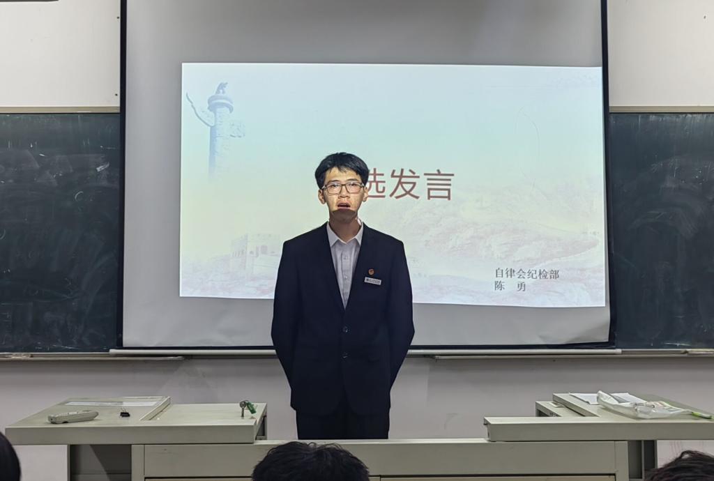 接下来由李益坤老师进行发言。李益坤老师不仅对自律会的工作给予肯定,同时也对大家在自律会的成长给予了很大的肯定,用一个个生动的例子表达了对大家的期望。