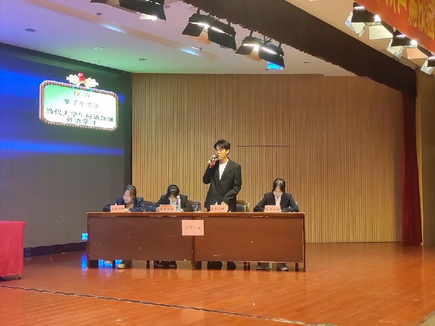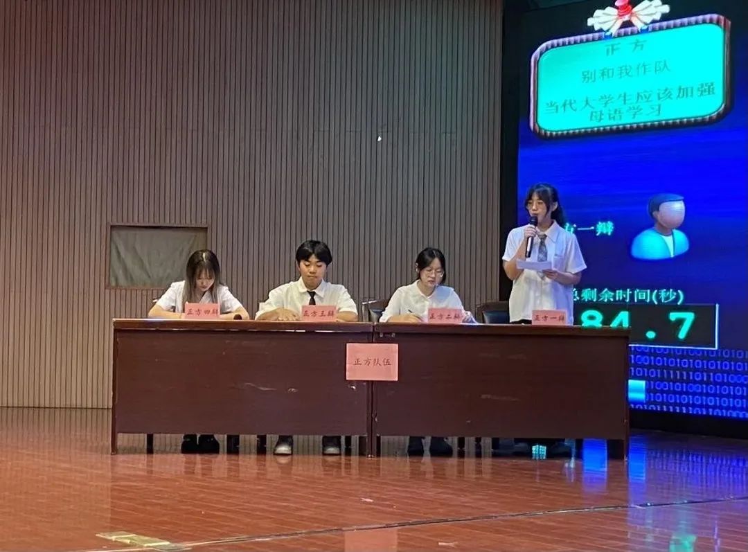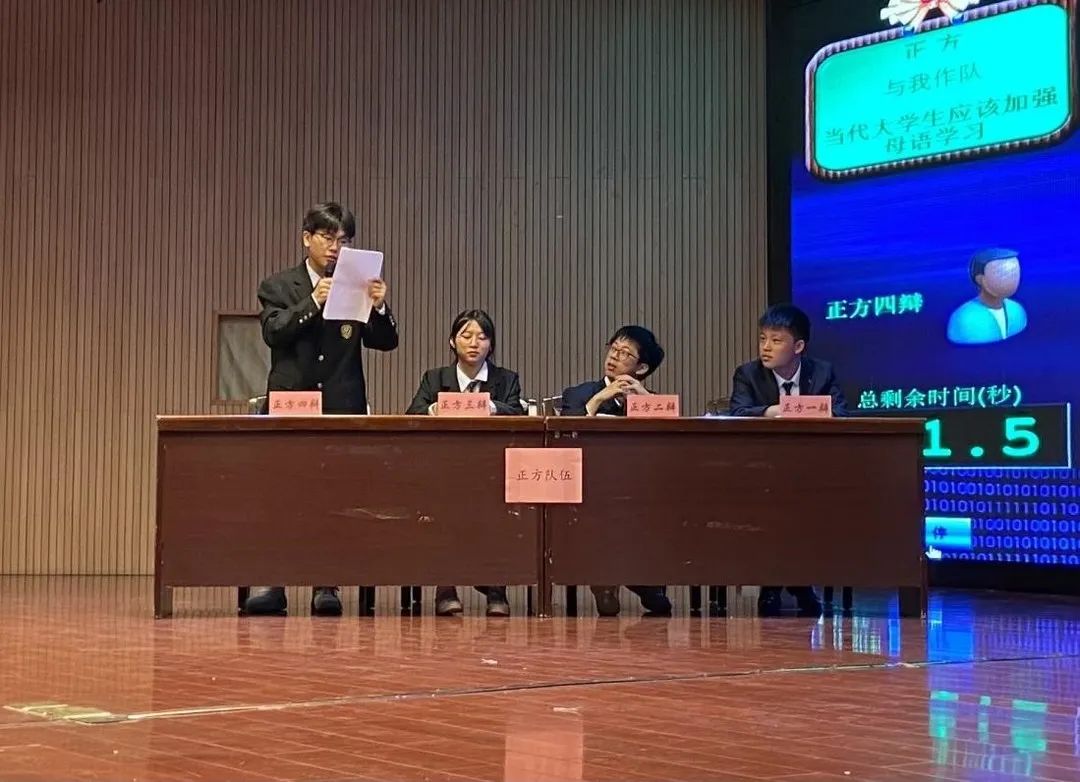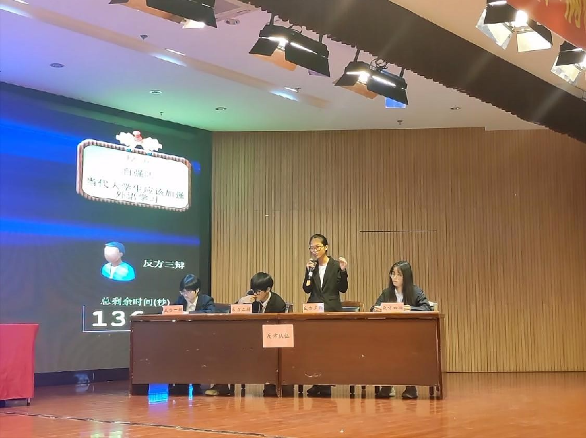 经过各学院的角逐与博弈,四个学院各有一支代表队伍参加此次半决赛。比赛共分为陈词、质询、小结、自由辩论、总结陈词5个环节,正反双方围绕“当代大学生应加强母语学习还是外语学习”展开激烈交锋。第一场比赛商务与管理学院和人文学院的辩手们思路清晰,引经据典,字字珠玑,使现场气氛迅速升温。在随后进行的自由辩论环节中,双方选手就辩题展开更深层次的辩论,个个妙语连珠、舌战莲花,将比赛一次次推向高潮。