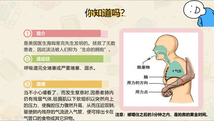 首先,主讲人用《人在囧途》电影视频中王宝强救人的方法引出海姆立克急救法,激发同学们的热情。该方法用于解决急性呼吸道异物堵塞,其征象为三不能(不能呼吸、不能咳嗽、不能说话)和“V型手”。她从“如何自救”和“如何帮助他人脱离危险”两方面进行讲解。