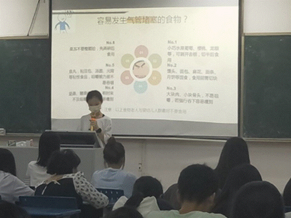 其次,主讲人对预防呛咳窒息的方法进行讲解,同时也跟大家分享了一些容易发生气管堵塞的食物,提醒大家在饮食时要注意的细节。
