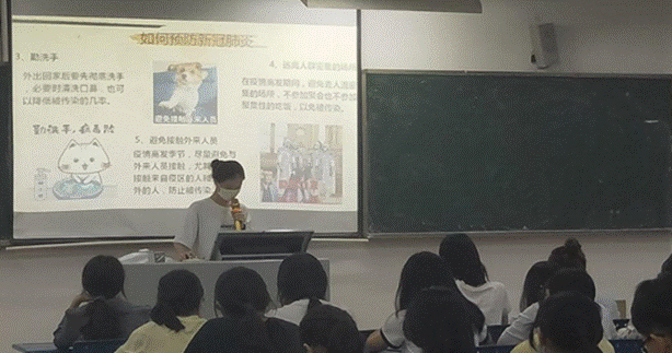 紧接着,主讲人为大家讲解了新冠肺炎病毒的特征,补充了在防疫期间自我保护以及双十一这一特殊时间段里正确对待快递的小知识,搭配视频让大家对这些知识更加印象深刻。
