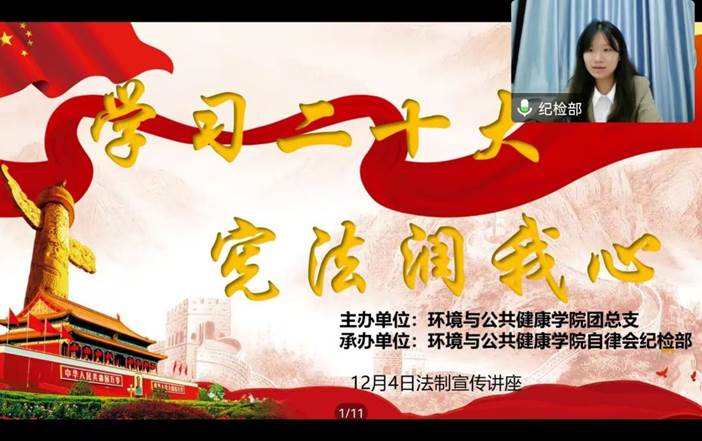 为深入学习宣传贯彻党的二十大精神,加强宪法学习,宣传宪法精神,维护宪法权威,推动全面贯彻实施宪法,弘扬社会主义法治精神,增强同学们对我国宪法的了解,今年会jinnianhui官网自律会纪检部于2022年12月4日19:30开展“学习二十大,宪法润我心”法制宣传线上讲座。