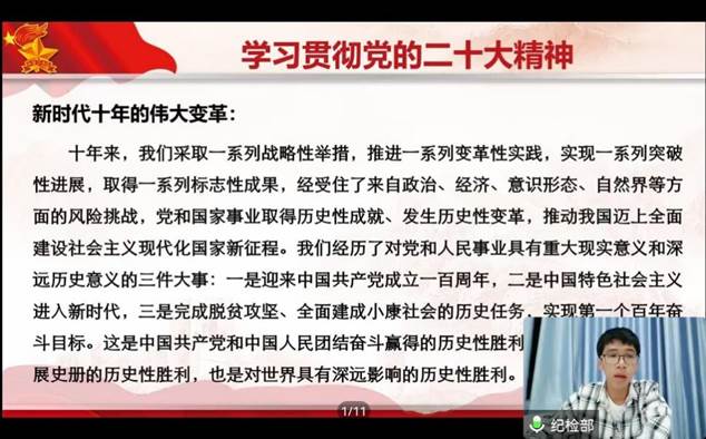 随后,由纪检部副部长陈勇为大家宣讲“党的二十大精神”,让同学们深刻领悟“两个确立”的决定性意义,增强“四个意识”、坚定“四个自信”、做到“两个维护”,自觉用党的二十大精神统一思想和行动。此次宣讲,让同学们对“党的二十大精神”有了更深的理解和体会。