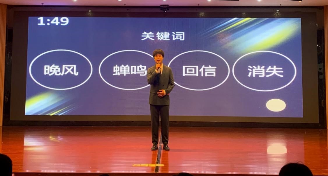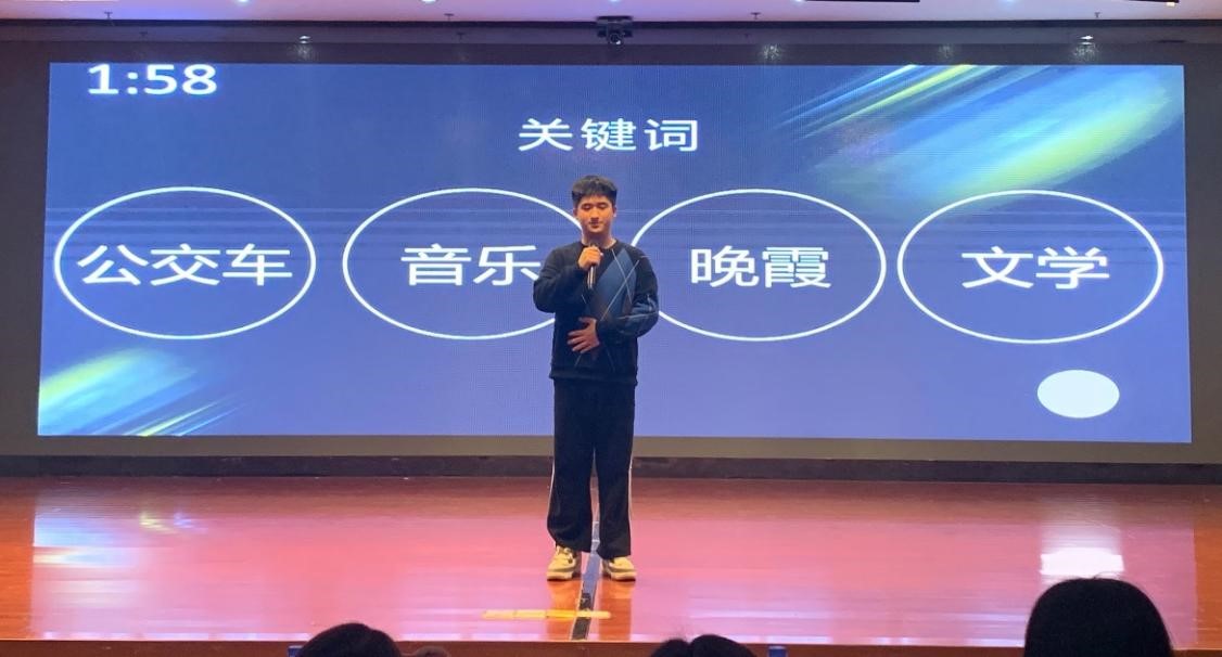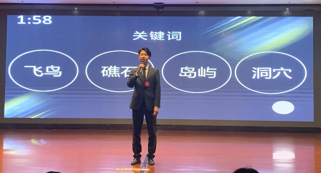 第二环节,每位参赛选手将现场抽取题目进行30秒的即兴创作,并在2分钟内进行阐述。题目均为一组描述事物的四个词语,要求选手在规定时间内演绎成一个故事进行描述。11位选手以不同的风格角度阐述了一个个引人入胜的小故事,娓娓动听,妙趣横生,仿佛身临其境。