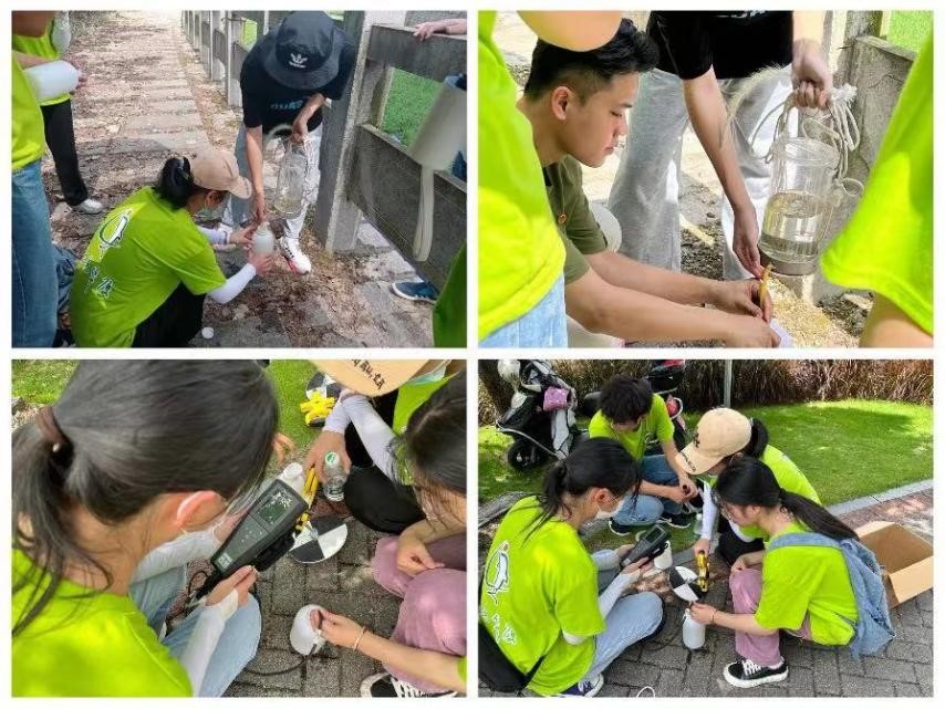 在环境科学与工程专业的队员们采集温泉水样的同时,其他队员于河岸两堤清捡垃圾废物,洁净草地。统筹水上、岸上污染治理,实现河湖环境整洁优美、水清岸绿。