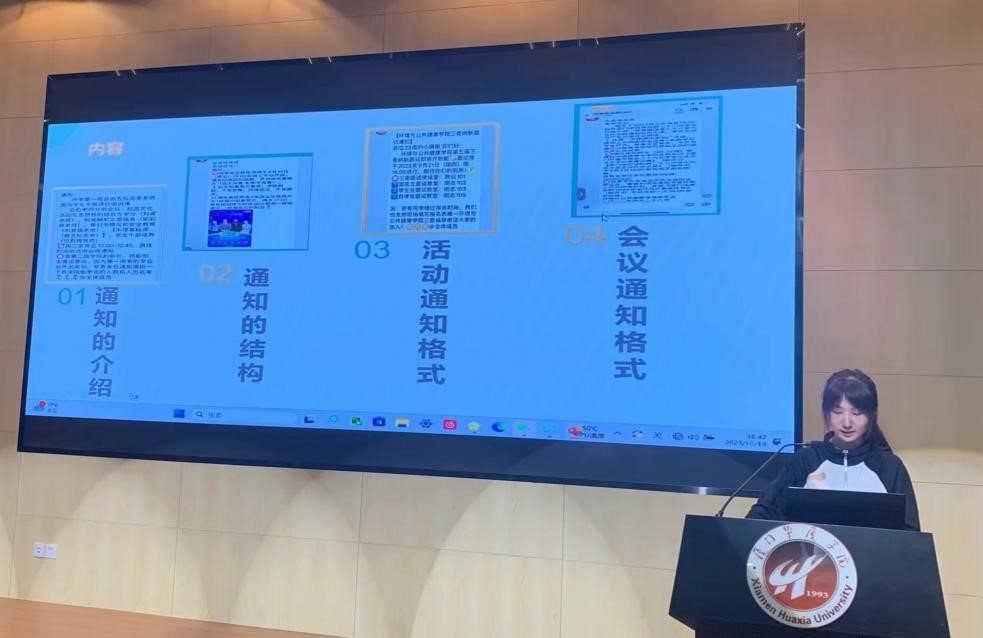 其次,学生会办公室(权益维护)负责人钼佳仪向大家介绍通知的撰写和注意事项。通知是在我们的日常生活和工作中扮演着重要的角色,能够传达重要信息,保障工作的顺利进行。