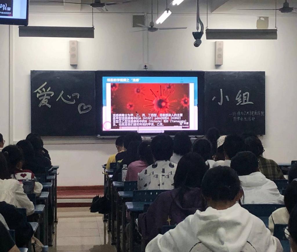 热身游戏结束后,主讲人通过讲授、设问等教学方法开展本次课程内容——预防、应对流感、晕车(晕船)、溺水、摔伤(划伤)的有效方法。