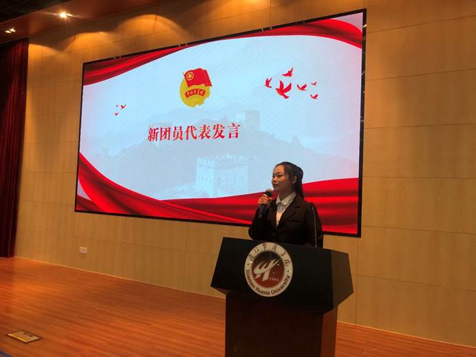 “士不可以不弘毅,任重而道远”。袁鑫同学作为老团员代表,对新团员的加入表示热烈的祝贺和欢迎,并向新团员提出要明确目标和方向、注重实践和行动、时刻保持学习和进步的态度这三点要求。最后,她希望新团员们在今后的学习与生活中能展现共青团员的责任与担当,为实现中华民族伟大复兴的中国梦而奋斗。