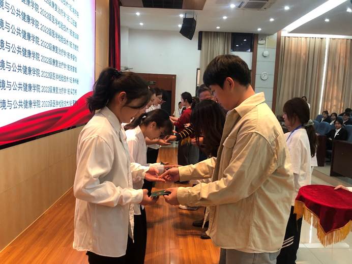 各位老师为新团员颁发团员证、佩戴团徽。小小的团徽蕴藏着沉甸甸的团员责任,从戴上团徽的这一刻起,新团员们将用更高的标准要求自己,努力提高自身的思想觉悟,同时脚踏实地,积极地在学院各项活动中起好模范带头作用。