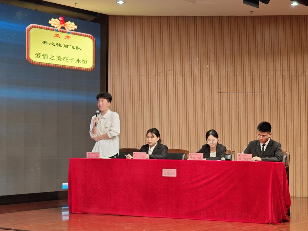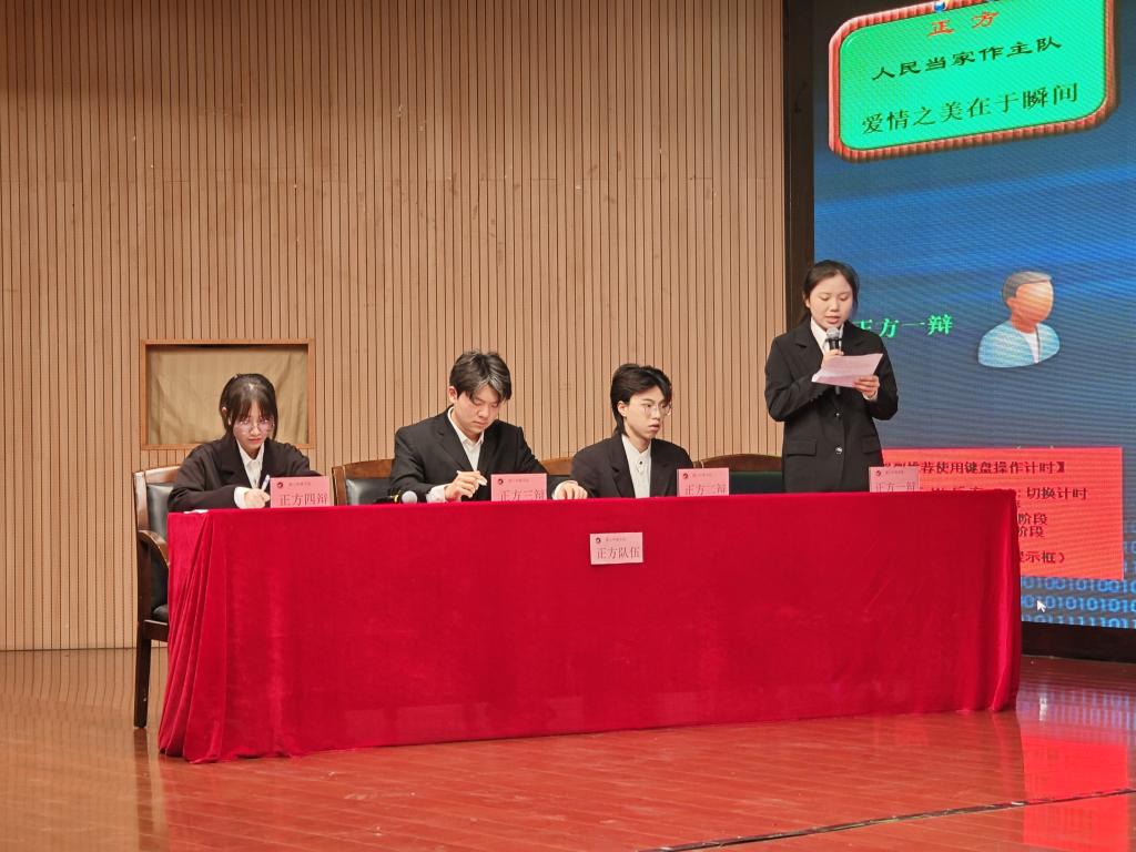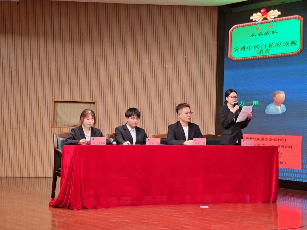 经过初赛的选拔,共有四支优秀代表队脱颖而出。决赛过程中,选手们充分展现了扎实的辩论功底和卓越的口才水平。十六位辩手旁征博引、妙语连珠,结合理论与现实充分论证“爱情之美在于瞬间还是在于永恒”、“灾难中的自私是否应该被谴责”的现实及社会问题。双方针锋相对、互不相让,为大家奉献了一场有理有据的精彩辩论。