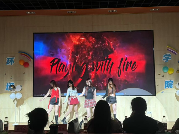 排舞协会活力开场,用《Playing with fire》拉开了本次比赛的帷幕。此次比赛共有12名选手参赛,分三个环节:自我介绍、现场播音、“与时代同行”主题演讲。