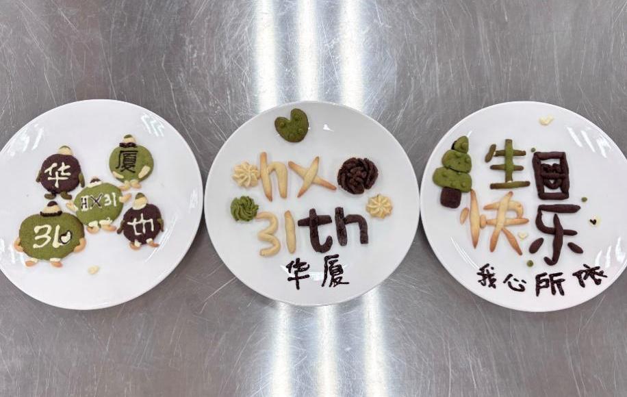 在曲奇制作比赛如火如荼地进行之际,柯朝阳体育馆前的摊位点也吸引了众多同学参与,他们用纸笔写下对学校最诚挚的祝福。