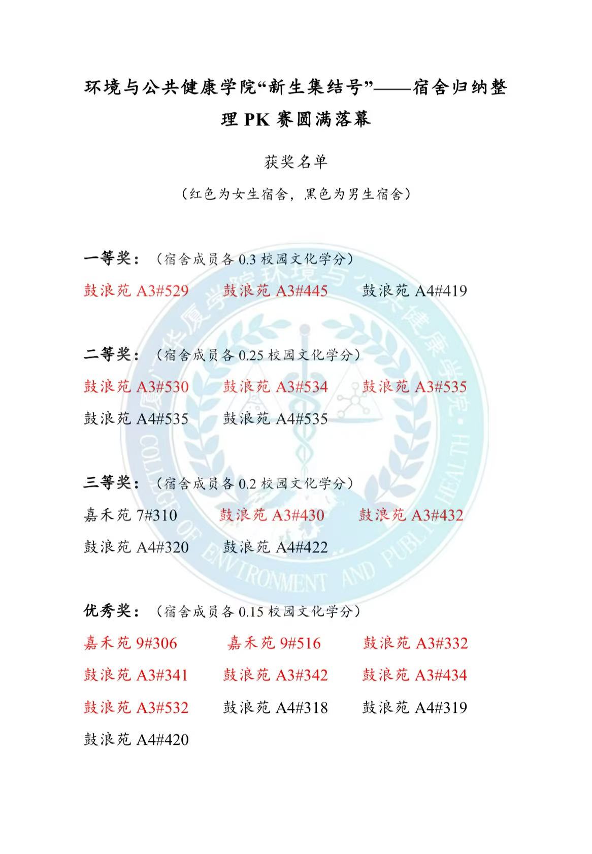 9#306、9#516、A3#332、A3#341、A3#342、A3#434、A3#532、A4#318、A4#319、A4#420宿舍荣获优秀奖,被评为“潜力宿舍”。