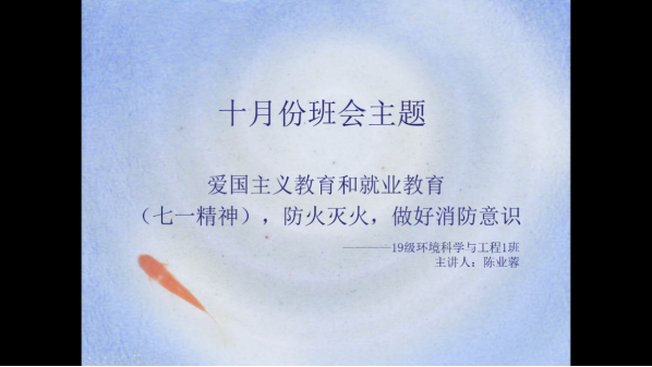 结合“七一”精神,19环境1班于2021年10月18日上午在线上召开了十月份“爱国主义教育和就业教育,防火灭火,做好消防意识”主题班会。荣幸地邀请到辅导员与班级同学交流分享宝贵经验。