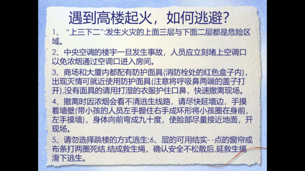 最后,结合思明区罗宾森小区火灾事件,进一步对我班普及了高楼防火知识。