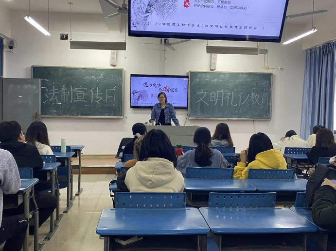 为了加强法制宣传教育,增强学生的自我保护意识,让学生养成学法、懂法、依法办事的好习惯,同时提高大学生自身身心修养,规范自身行为习惯。20制药工程(专升本)2班于2020年12月8日星期二下午5点30分在明志楼202教室开展“法制宣传日”和“文明礼仪教育”主题班会。出席本次班会的有辅导员叶晓娟老师和班级全体同学。