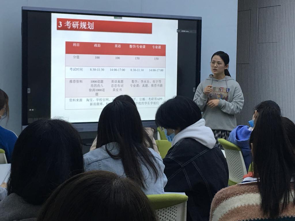 接着是福建农林大学在读研究生陈咏诗学姐和集美大学在读研究生陈翠莹学姐跟同学们分享自己整个考研的过程。两位学姐在分享过程中着重强调了学习的重要性,特别是专业公共课领域和政治、英语方面,要学会充分利用网络上的学习资源。