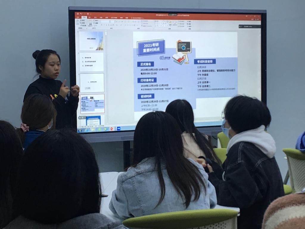本次活动由四位在读研究生学姐依次分享自己的考研经验。首先是集美大学在读研究生陈琳珉学姐给大家介绍考研常识、考研规划以及初试和复试的大概流程和时间。通过陈琳珉学姐的介绍内容,使同学们更加全面了解整个考研流程。
