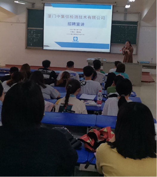 本次邀请到校宣讲的食品生产型企业5家,分别是厦门益斯麦食品有限公司、福建安井食品股份有限公司、厦门银祥油脂有限公司、厦门陈记乐肴居食品有限公司、厦门元初食品有限公司。邀请到校宣讲的食品检测机构4家,分别是厦门中集信检测技术有限公司、厦门泓益检测技术有限公司、通标标准技术服务有限公司厦门分公司(SGS厦门分公司)、厦门华测检测技术有限公司。