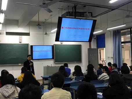 胡宏友副教授从厦门市水资源状况、厦门市的原水供应、厦门市自来水厂介绍、城镇污水处理与水污染减排、厦门市城市污水处理概括、厦门市黑臭水体及其治理等方面展开介绍。最后就厦门市给排水相关行业就业情况给同学们提供了就业方向,强调了环保行业作为新时代的朝阳行业,正在蓬勃发展,亟需大量环境专业的人才,鼓舞了同学们投身环保事业的信心。