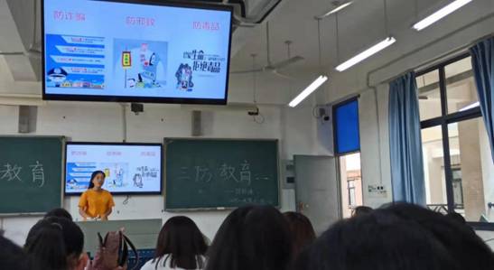 由于近期诈骗案件多发,讲解人黄晓晴着重讲解了“三防”内容——防诈骗、防邪教、防毒品,增强同学们的防骗意识。
